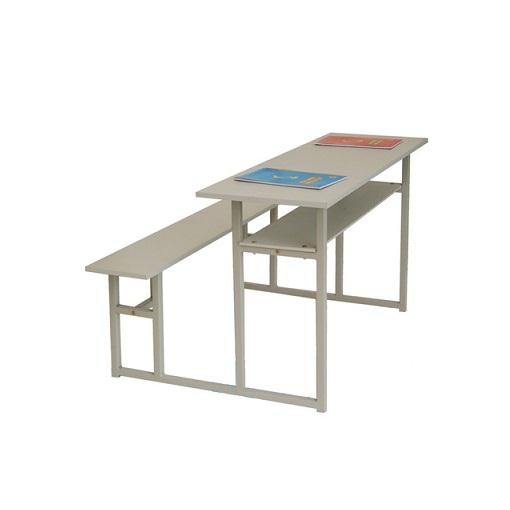 Bàn thiết kế liền ghế không tựa, ống thép chính Φ25×25 sơn tĩnh điện. Chất liệu mặt bàn, ghế gỗ melamine dầy 18mm, ngăn bàn dầy 15mm.
